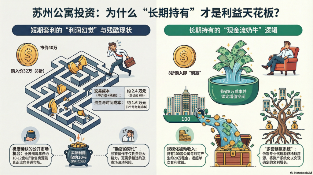 在房地产投资圈,很多人迷恋“低买高卖”的快感,试图通过快进快出的套利模式实现财富爆发。但在苏州公寓市场深耕16年后,我要告诉你一个违背直觉的真相: