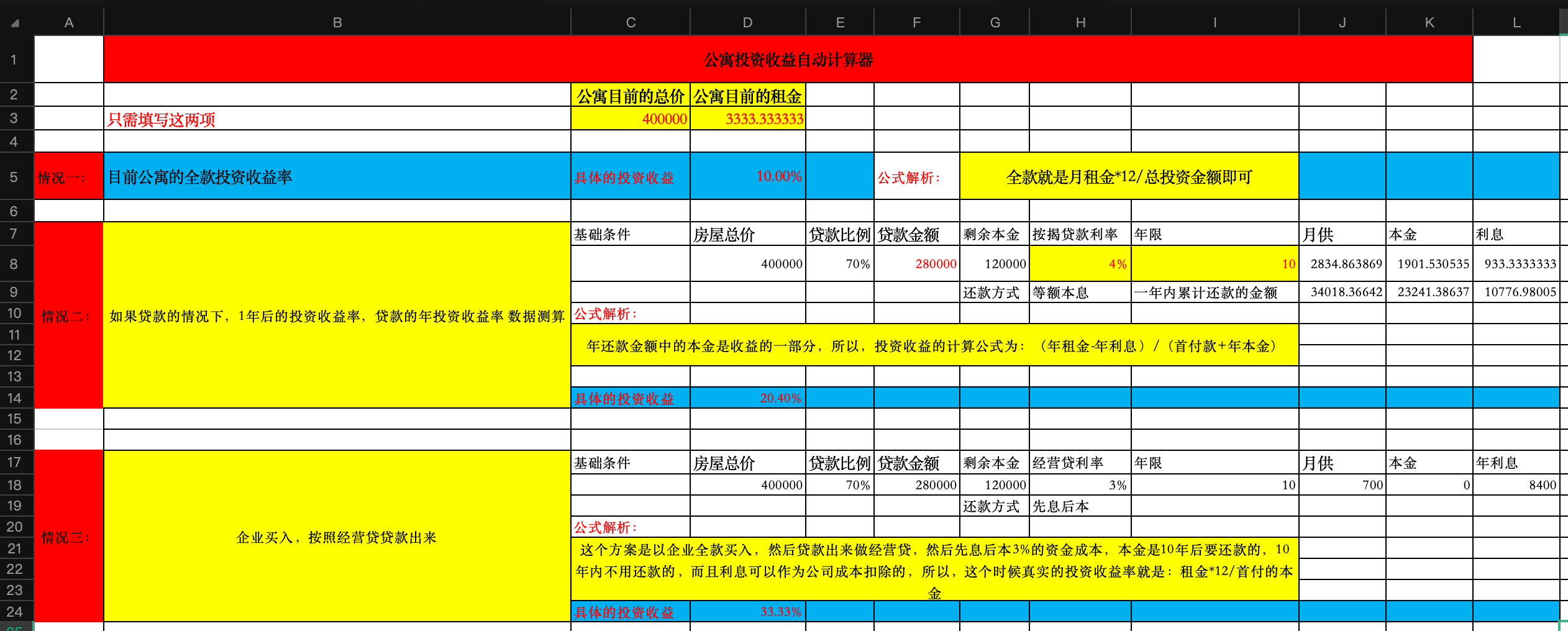 我们以一个具体的案例来贯穿全文,数据基于您提供的“公寓投资收益自动计算器”:
