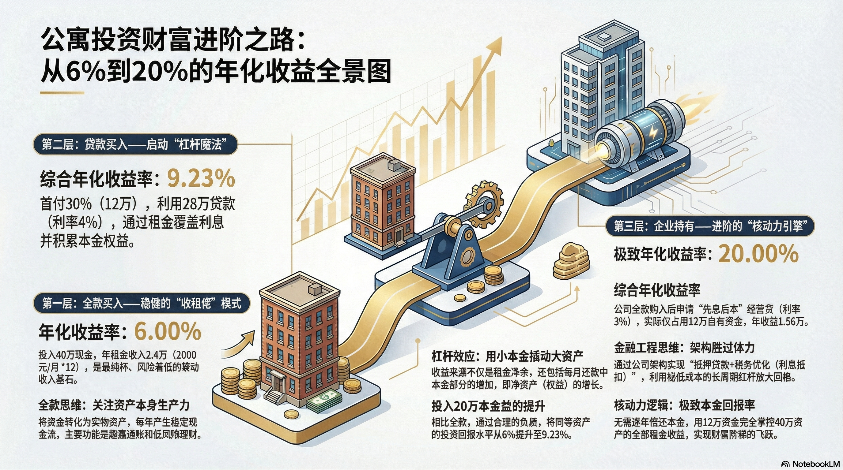 解读:这个20%的收益率,揭示了企业持有模式的精髓。你用 仅12万的自有资金,就完全掌控了一套价值40万的资产,并享受其全部租金收益。极致的杠杆效应,带来了极致的本金回报率。