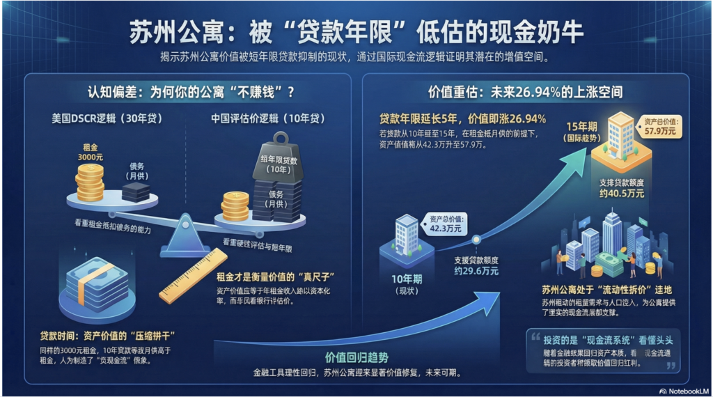 这意味着:只要金融政策稍作调整——仅仅延长5年期限——苏州公寓在保持“租金抵月供”的健康状态下,其市值本身就有 26.94% 的上涨空间。