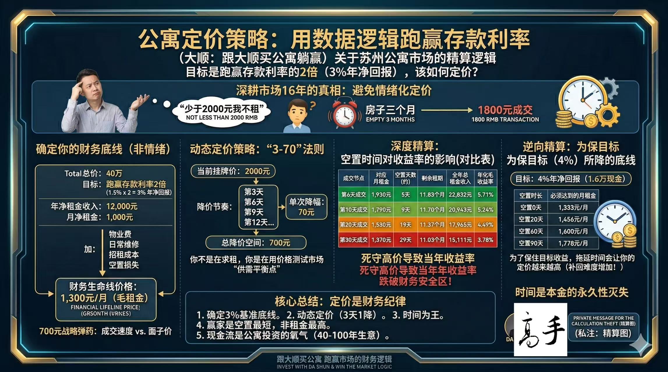 很多业主说:“大顺,我不求6%,我就想稳稳拿个4%的净回报,我该如何有效的定价呢?”